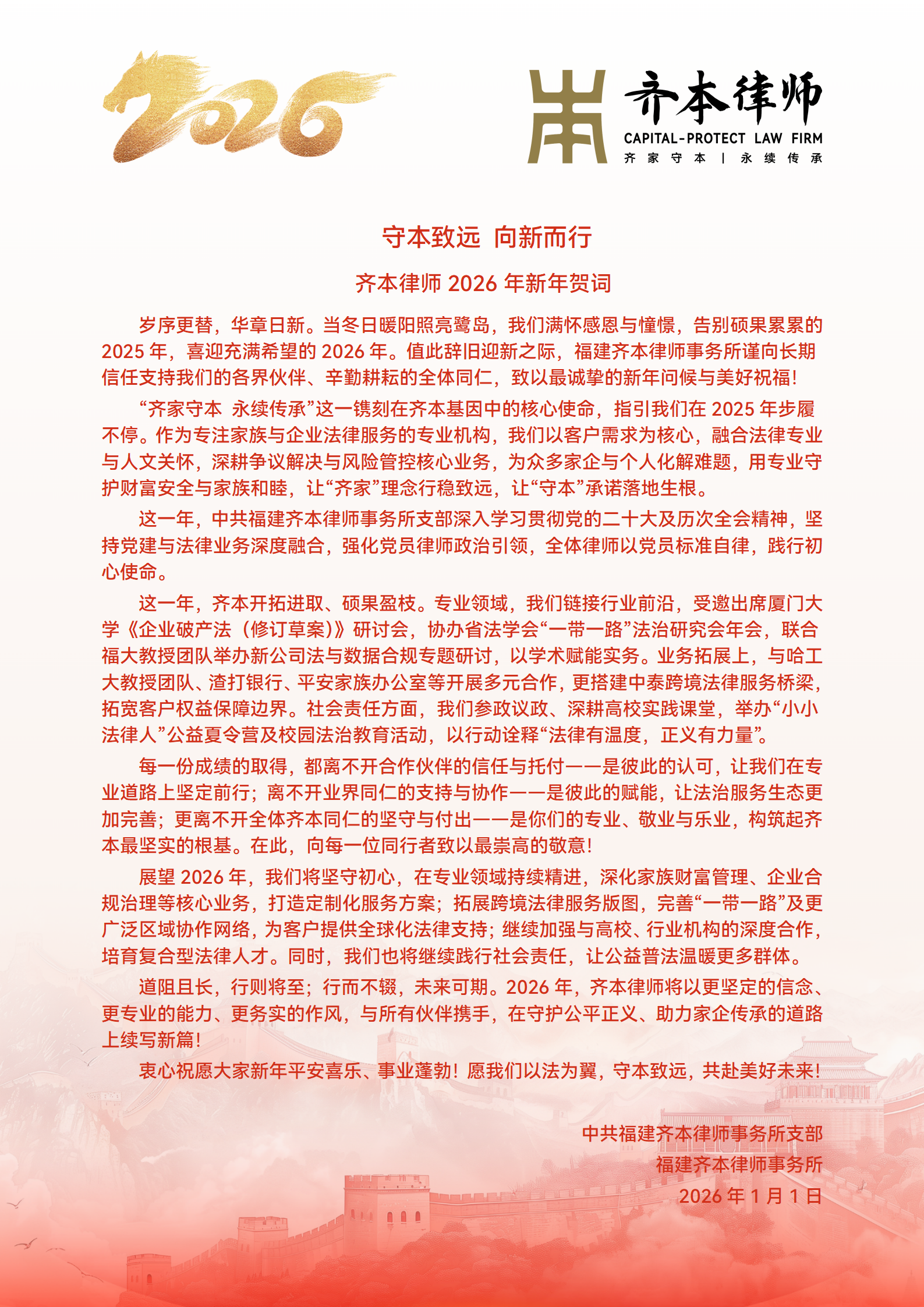 岁序更替,华章日新。当冬日暖阳照亮鹭岛,我们满怀感恩与憧憬,告别硕果累累的2025年,喜迎充满希望的2026年。值此辞旧迎新之际,福建齐本律师事务所谨向长期信任...